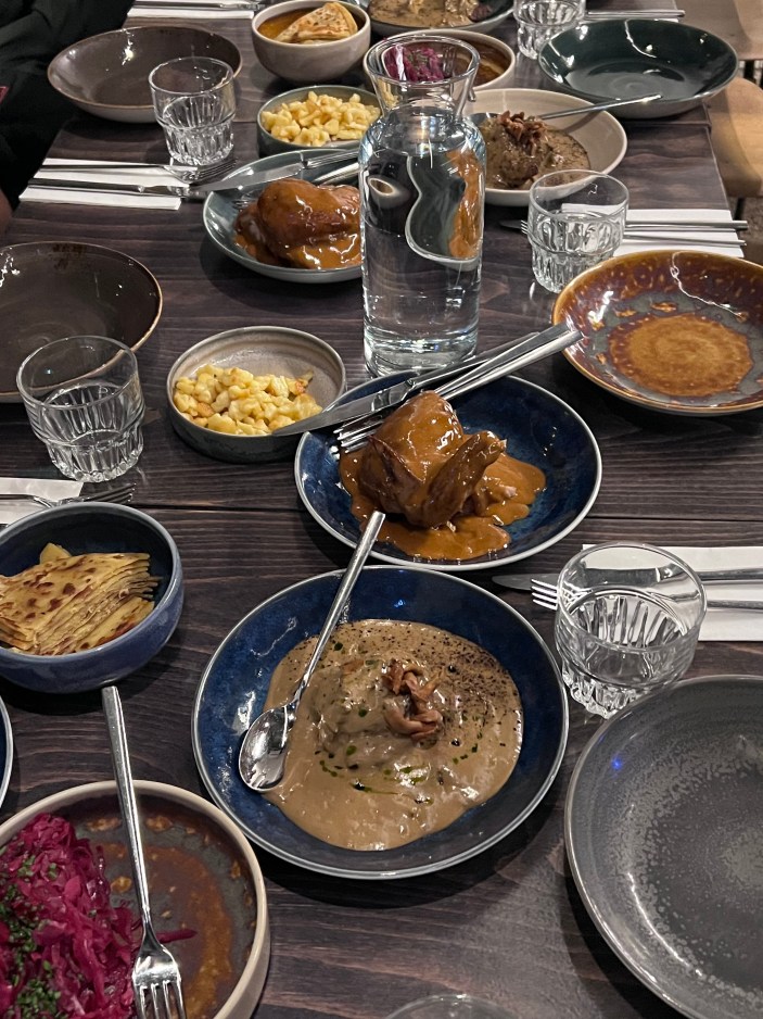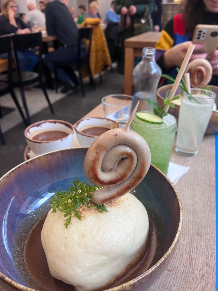 Nous avons commencé avec un verre de Pilsner, avec votre choix de couler; Čochtan (no foam), Hladinka (20-25% foam), Šnyt (half foam/half beer), or Mlíko” (almost entirely foam). Americans would send that back, but locals love their foam and believe it adds to the drink. We shared fried cheese with tartare sauce, marinated hermelin cheese, potato salad, a variety of sausages and local ham with creamy horseradish à Dlouha 33.