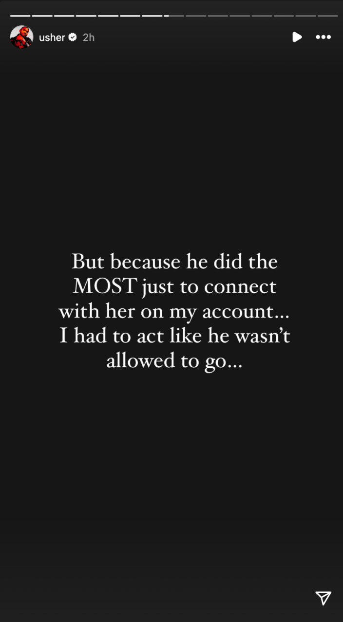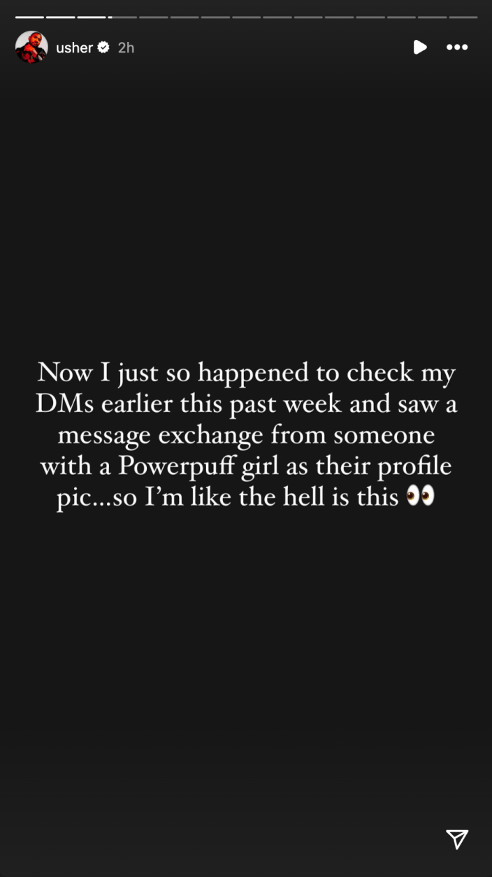 Ensuite, Usher a raconté ce qui s'est passé de son point de vue, en écrivant : « Maintenant, il m'est arrivé de vérifier mes DM plus tôt la semaine dernière et j'ai vu un échange de messages de quelqu'un avec une fille Powerpuff comme photo de profil… alors je me dis que c'est l'enfer. ce. » (L'icône Instagram de PinkPantheress est la Powerpuff girl Buttercup.)