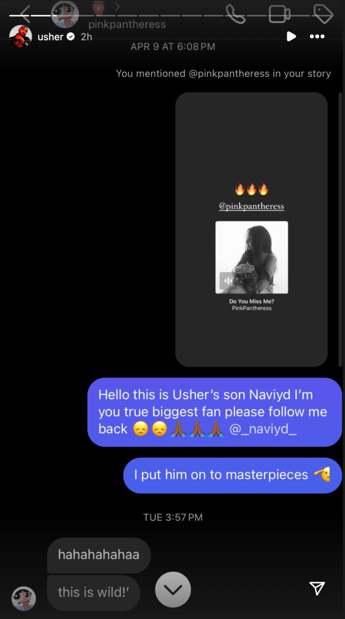 Le message suivant est une capture d'écran du DM de Naviyd du 9 avril, disant : « Bonjour, c'est le fils d'Usher, Naviyd, je suis votre vrai plus grand fan, veuillez me suivre @_naviyd_, je l'ai mis sur des chefs-d'œuvre. » PinkPantheress a gracieusement répondu : « hahahahahaa, c'est sauvage ! »
