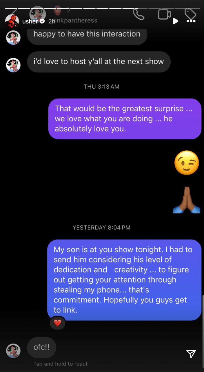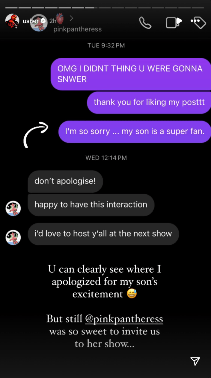 Usher a poursuivi: « Je l'ouvre et je me dis oh, ce garçon a fait un DMd à cette fille depuis mon foutu téléphone.. » Le message suivant est une autre capture d'écran – cette fois, montrant Usher envoyant des excuses à PinkPantheress: « Je suis vraiment désolé … mon fils est un super fan. Encore une fois, PinkPantheress a été extrêmement aimable et a répondu : « ne vous excusez pas ! heureux d'avoir cette interaction. J’adorerais vous accueillir au prochain spectacle.