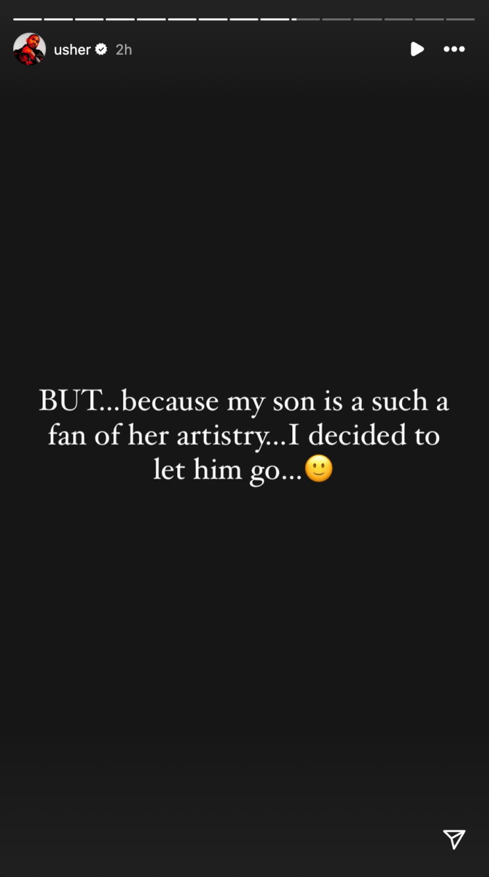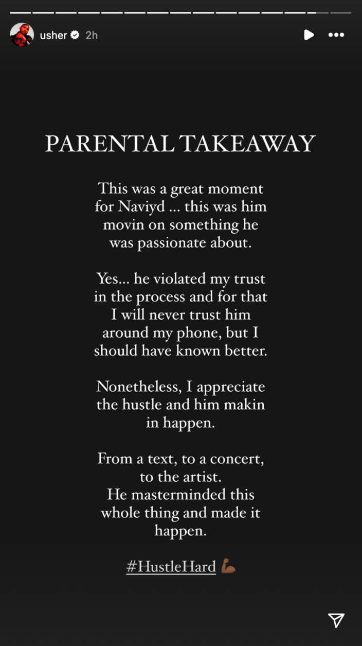 « À EMPORTER PARENTAL », a écrit Usher en conclusion. «C'était un grand moment pour Naviyd… c'était lui qui se déplaçait sur quelque chose qui le passionnait. Oui… il a violé ma confiance dans le processus et pour cela je ne lui ferai jamais confiance autour de mon téléphone, mais j'aurais dû le savoir. Néanmoins, j’apprécie l’agitation et le fait qu’il y parvienne. D'un texte, à un concert, à l'artiste. Il a organisé tout cela et a fait en sorte que cela se réalise.