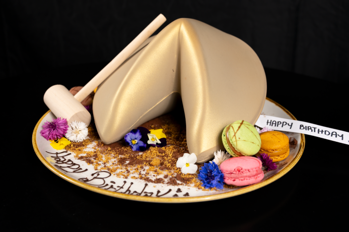 Comme tout bon biscuit chinois, vous devez l’ouvrir. Pas pour les âmes sensibles, ce dessert est si robuste que vous aurez besoin d'un maillet en bois et de plus d'un bon coup pour faire fortune. Oui, fidèle à son nom, vous pouvez précommander et personnaliser une fortune de 50 personnages pour l'invité d'honneur. C'est ludique, un peu théâtral, et exactement le genre de nouveauté qui fonctionne dans une salle déjà aménagée pour des occasions spéciales.