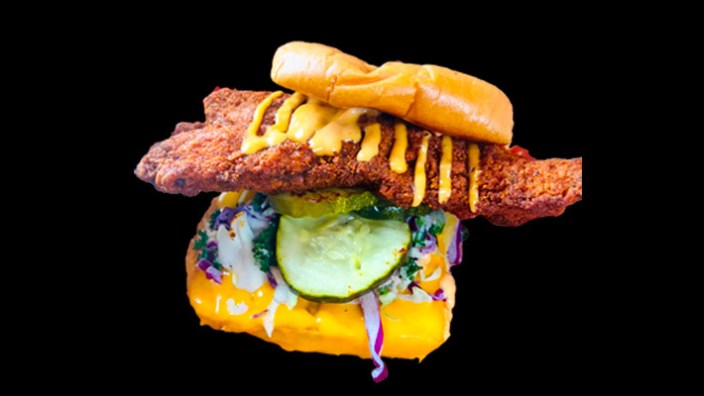 Entre un petit pain au beurre se trouve un tendre de poulet gargantuesque arrosé d'une sauce de style retour assis sur un lit de cornichons épais et croquants, de salade de chou frisé et de fromage. Le sandwich est personnalisable avec sept niveaux de chaleur différents, et nous vous suggérons de commencer par « Hot » et de progresser jusqu'à « Extra Hot » ou « Reaper » si vous souhaitez une expérience qui fait transpirer.