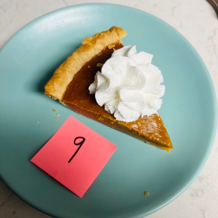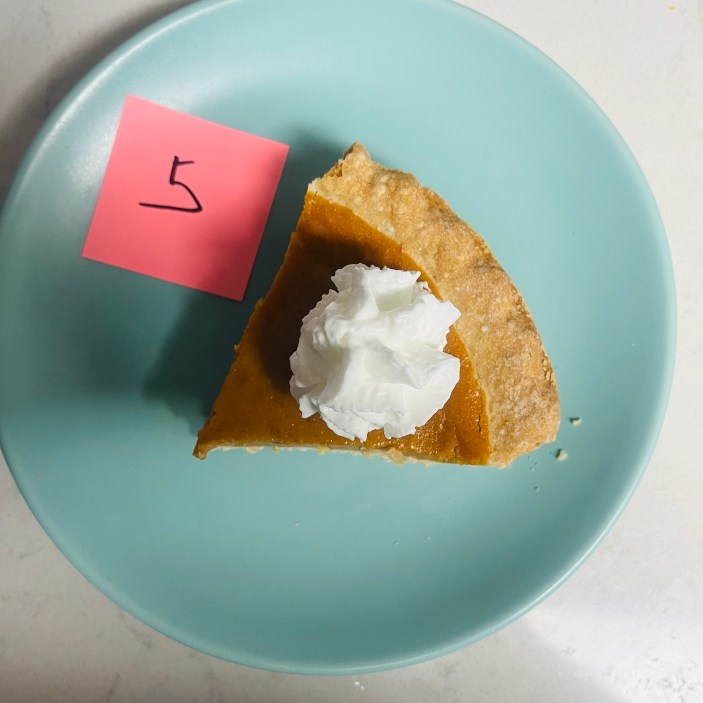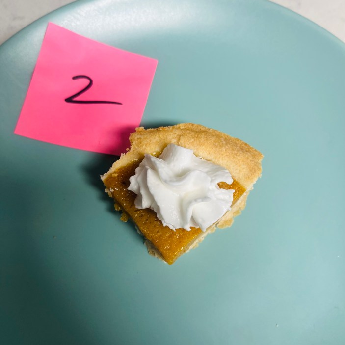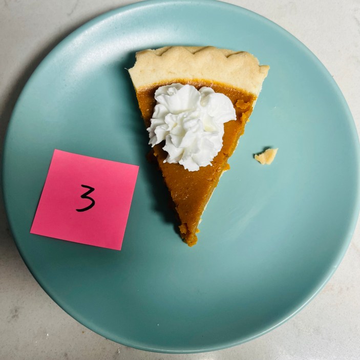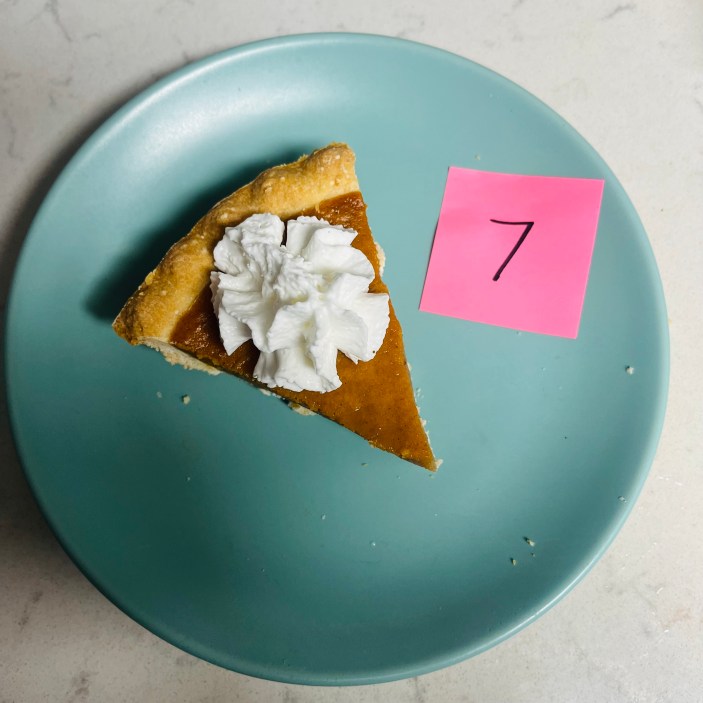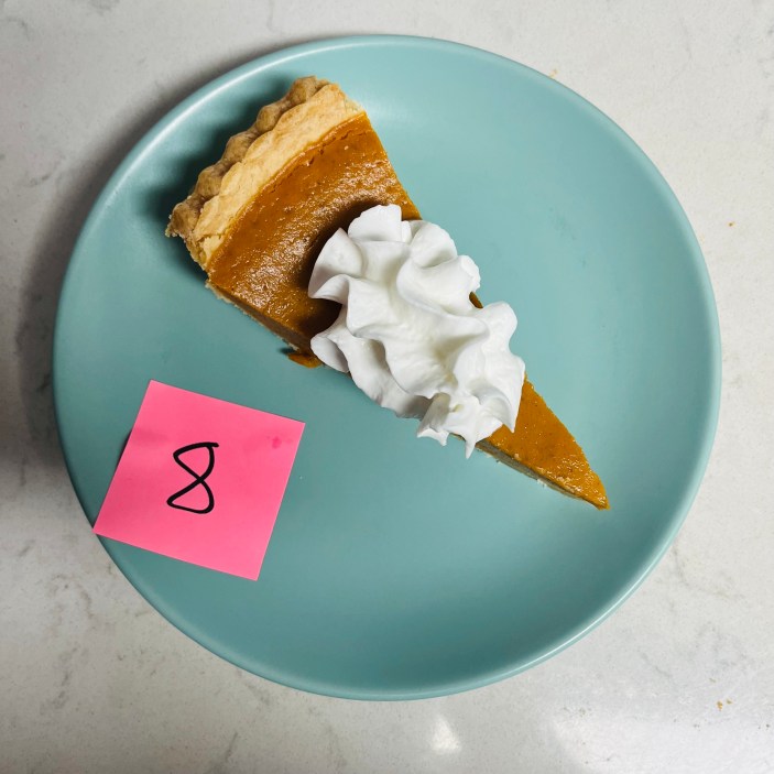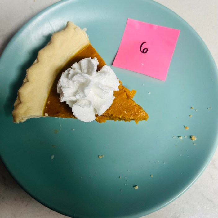 Une fois toutes les tartes rassemblées, j'ai demandé à ma copine de m'en servir une part au hasard avec une cuillerée de chantilly, j'ai enfoncé ma fourchette et j'ai noté mes premières impressions. Pour chaque tranche, j'ai veillé à me concentrer à la fois sur la crème anglaise à la citrouille et sur la croûte à tarte.