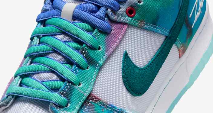 La sneaker présente une tige en toile blanchie avec des lacets bicolores, des panneaux psychédéliques tourbillonnants, des coutures contrastées et la marque Futura brodée sur le talon et la languette. C’est de loin le meilleur Dunk à sortir cette année (jusqu’à présent).