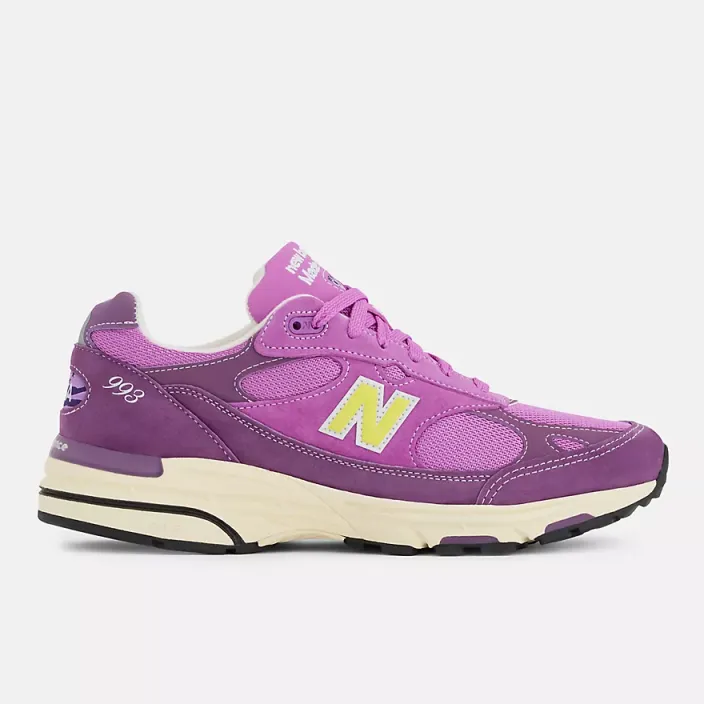 Cette version n'est pas une collaboration majeure, mais elle est issue de l'aile Made in USA de New Balance, et cela seul la rend remarquable ! Cela aide également qu'il soit superbe. La sneaker reprend la silhouette 993 et l'habille d'une construction en maille, en daim et en synthétique dans un coloris fruit de la passion brillant avec des superpositions violet foncé.