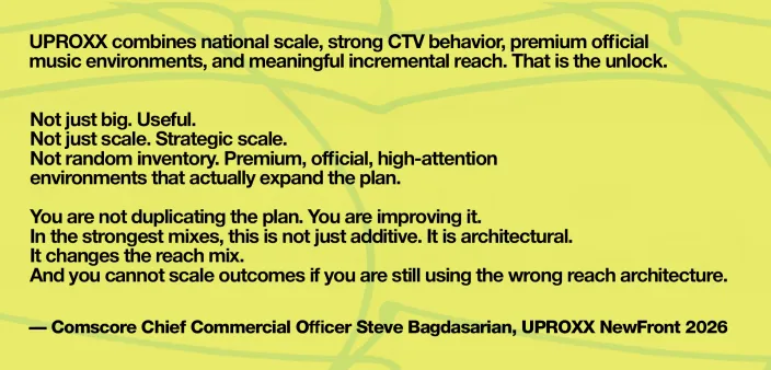 Lors de NewFronts 2026, Steve Bagdasarian, directeur commercial de Comscore, a défini la portée, la position concurrentielle et l'efficacité d'UPROXX TV en termes clairs.